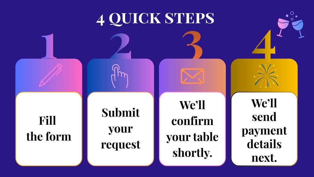 Answer: Submit a reservation request through the NYE form. Our team will contact you to confirm availability and arrange payment.