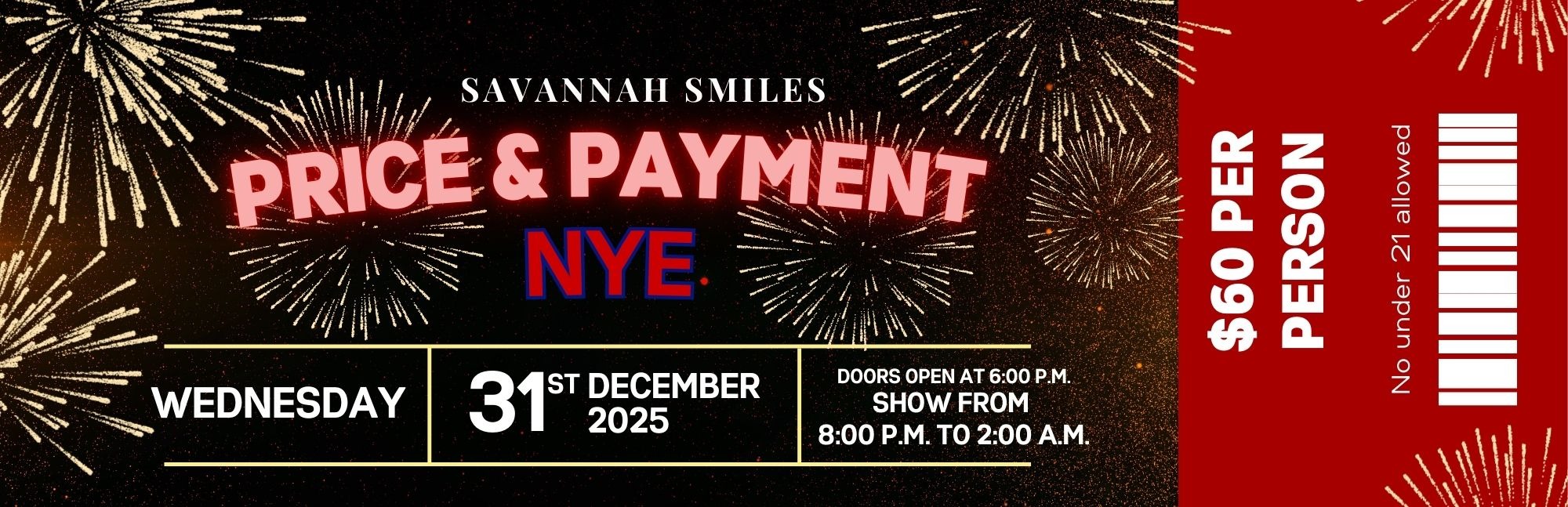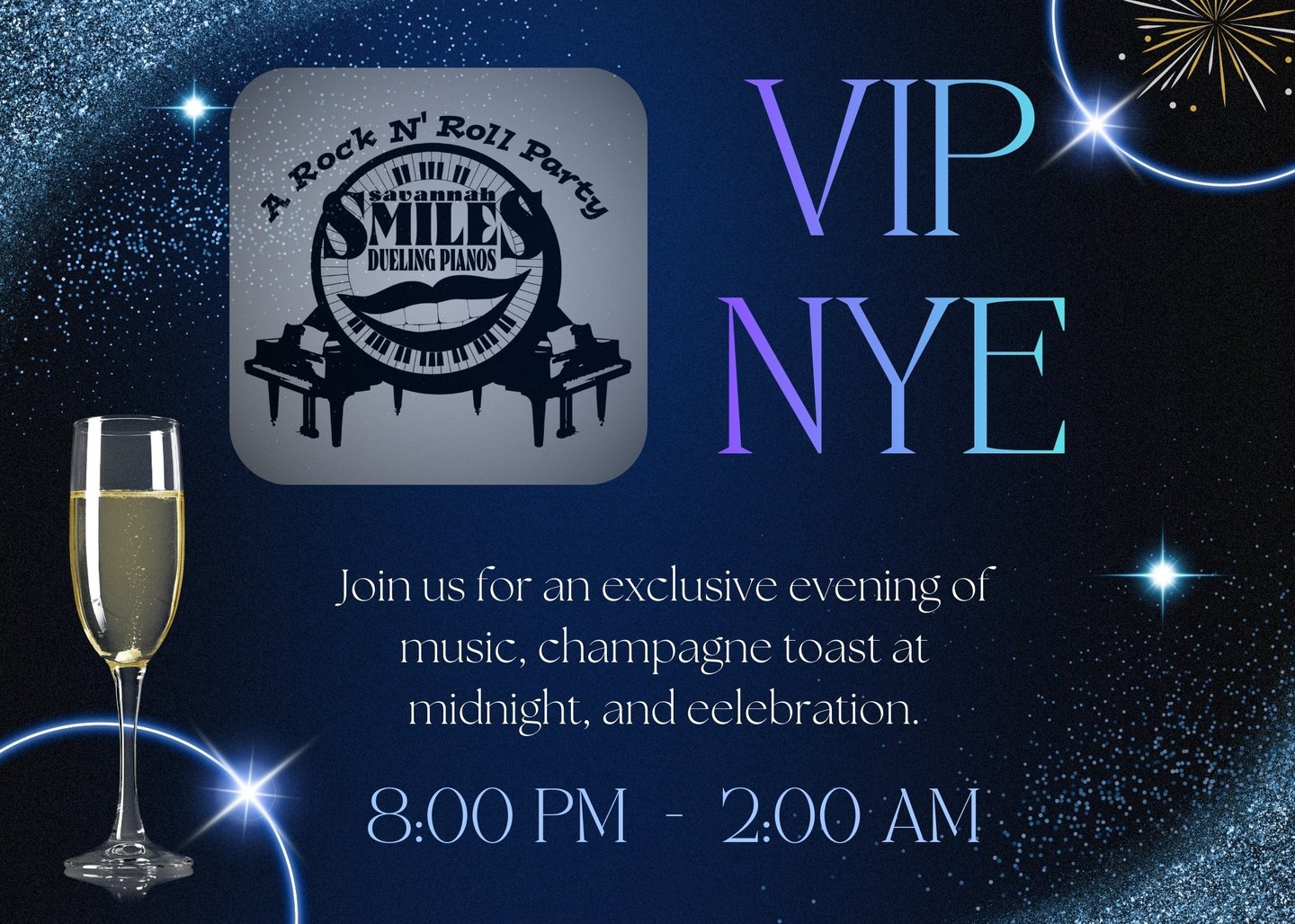 Celebrate New Year’s Eve at Savannah Smiles with a Reserved Seating experience designed for comfort, great music, and an energetic countdown to midnight. Enjoy table service, elevated party favors, and the full dueling pianos show from 8 PM to 2 AM. Doors open at 6:00 p.m.