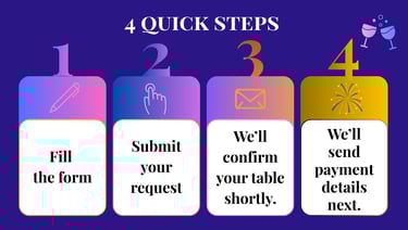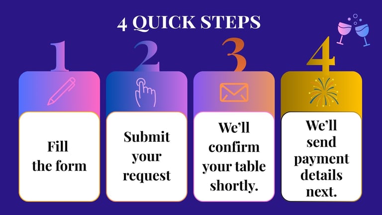 Submit a reservation request through the NYE form. Our team will contact you to confirm availability and arrange payment.